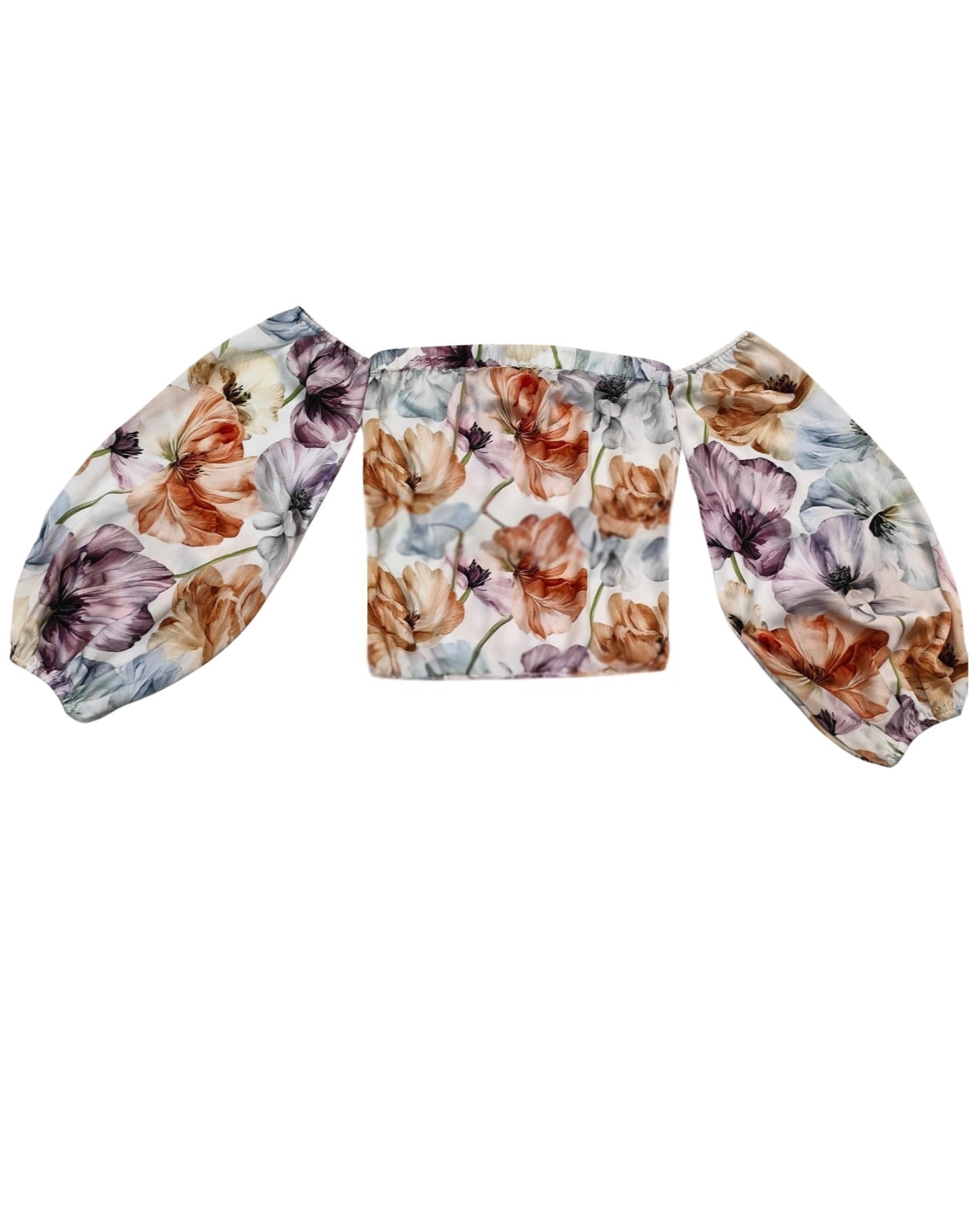 Woman wearing a floral off-shoulder top and jeans standing against a light-colored wall.